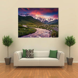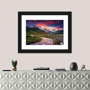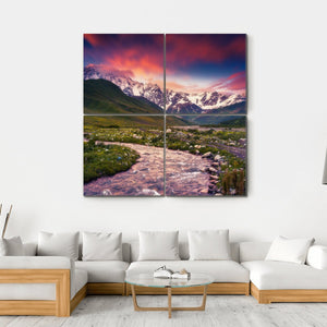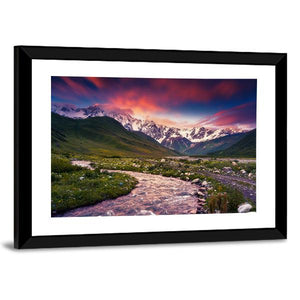 This captivating canvas features the majestic Mt. Shkhara in Georgia, showcasing a breathtaking mountain range paired with a winding river and vibrant sunset sky. The serene yet dramatic scene evokes a sense of tranquility and natural beauty.