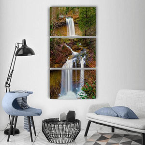 A peaceful landscape canvas that captures a multi-tiered waterfall flowing through forest, rocks, and autumn foliage. The green, brown, white, and tan palette and rustic nature style suit rustic or nature-inspired rooms.