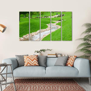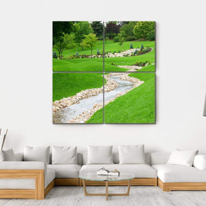 This beautiful canvas art captures a serene stream winding through manicured green hills, framed by lush trees and light-colored rocks. It creates a peaceful atmosphere that perfectly complements natural and modern decor.