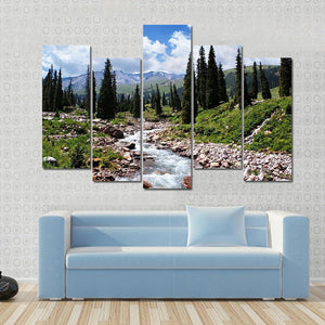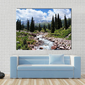 This canvas art captures a serene summer scene of a mountain river surrounded by lush coniferous trees and majestic, snow-capped mountains. With its realistic style and rich green and blue palette, it evokes a natural and wild atmosphere that brings the beauty of Kazakhstan into your space.