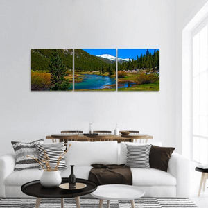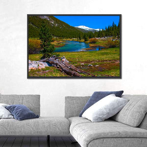 Lyell Fork Tuolumne River Panoramic Canvas captures a wide mountain scene with a winding river, pine forest, and snow-capped peaks under a clear blue sky. The realistic image uses blue, green, white, brown, and yellow tones for a serene, natural mood and suits modern or nature-inspired rooms.