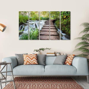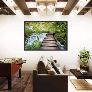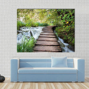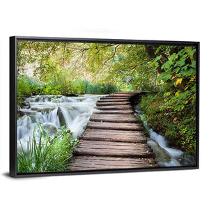 This canvas art captures a serene wooden boardwalk winding alongside a peaceful stream in a lush forest. The tranquil scene, featuring gentle motion blur on the water, invites a sense of calm and connection with nature.
