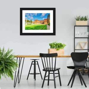 Boboli Gardens in Florence captures a sunny, serene view of palace gardens with a manicured, striped lawn, trees, and fluffy white clouds. Rendered in a realistic, photorealistic style, the print brings a calm, grand atmosphere to room decor and suits living rooms, hallways, or entryways.