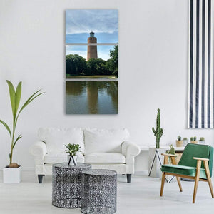 A photorealistic portrayal of a brick lighthouse framed by trees, with its lantern room reflected in calm water under a partially cloudy summer sky. The scene feels calm, serene, and peaceful, using brown, green, blue, and white tones. Works well as subtle wall decor in modern or nature-inspired rooms.