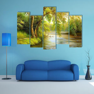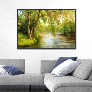 A summer wood lake scene with trees, foliage, a winding river and birds perched on a branch, with leaves hanging over the water. Soft greens and blues with warm browns and touches of yellow create a peaceful, tranquil mood, using depth and a rule-of-thirds composition to draw the eye into the scene. Fits well as a calming nature accent in living rooms or bedrooms.