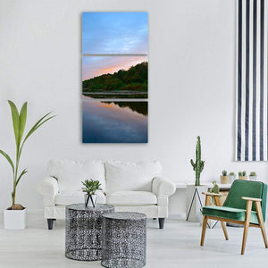 Peaceful, serene sunset over a lake featuring trees and their reflections in calm water. Soft blues, greens and warm pinks and oranges create a tranquil mood that suits modern or nature-themed rooms like living rooms and bedrooms.