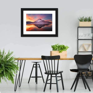 This landscape canvas captures a snow-capped mountain reflecting beautifully on a serene lake under a dramatic sunset sky. The warm tones of orange, pink, and purple create a peaceful yet awe-inspiring atmosphere, perfect for any nature lover.