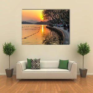 A calm view of West Lake at sunset, with warm orange and gray tones and soft reflections on the water. The rule-of-thirds composition highlights a line of posts and people walking along a path, creating a tranquil, warm, serene atmosphere that fits modern room decor.