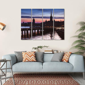 This stunning canvas captures the tranquil beauty of Gamla Stan with a serene city skyline, silhouetted buildings, and a striking sunset sky reflecting on the water. The calming palette of blue, pink, and orange adds an atmospheric touch to any space.