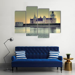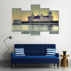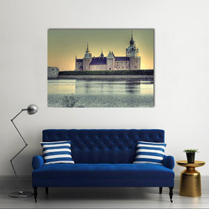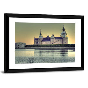 This canvas art captures the serene beauty of Kalmar Castle, featuring its majestic domed towers reflected in calm waters. The vintage style and rich palette of blues, greens, and browns evoke a sense of history and tranquility.