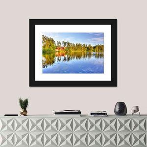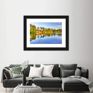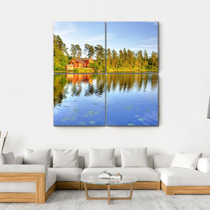 This serene canvas features a tranquil lake scene, complete with a charming red wooden cabin nestled among lush trees. The calming palette of blues and greens, accented by the gentle reflection on the water, brings a peaceful vibe, making it ideal for nature lovers.