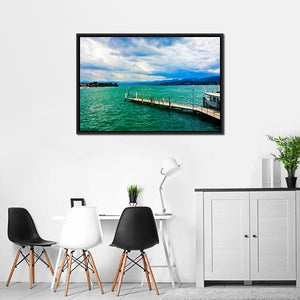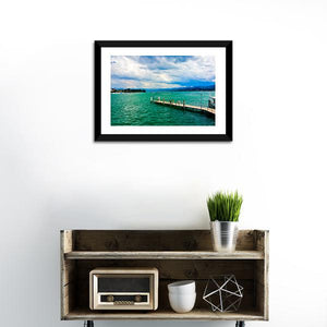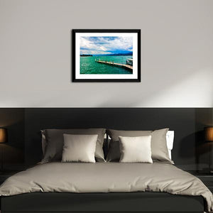 A panoramic landscape showing a wooden pier stretching into a calm lake, a boat at the dock, a distant town, and a mountain range beneath a cloudy sky. Rendered in realistic, vibrant teal, blue, green, white, and brown tones, the scene feels serene, peaceful, and expansive and suits modern, nature-inspired living spaces.