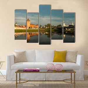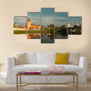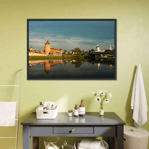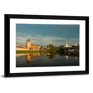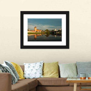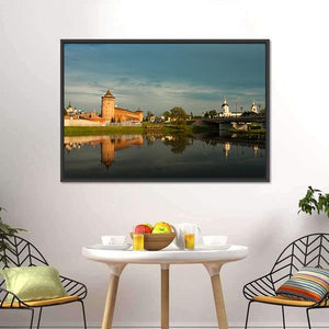 A riverside landscape showing Marinkin Tower, brick fortress towers, an arched bridge and dome-shaped churches reflected in calm water. Soft blues, warm oranges and earthy browns create a serene, historical, picturesque mood that suits traditional interiors and classic decor.