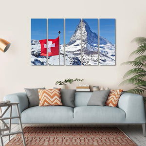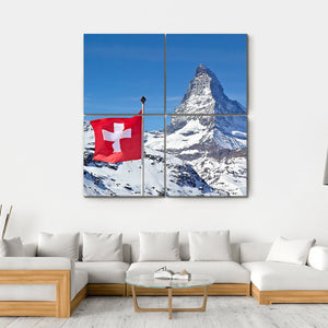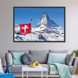This stunning landscape captures the majestic Matterhorn beneath a clear blue sky, accented by the vibrant Swiss flag. The serene atmosphere and photorealistic detail make it a captivating addition to any wall decor.