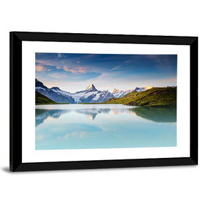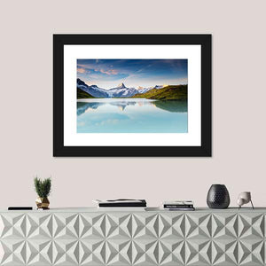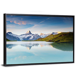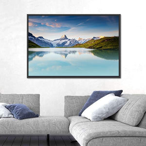 This canvas depicts snow-capped peaks mirrored in a calm mountain lake with clouds drifting across the sky. The photo-realistic scene feels serene and majestic, with blue, green, white, gray and subtle orange tones that suit house and modern room decor.
