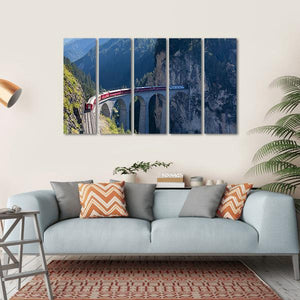 This striking canvas depicts a red train gracefully crossing a stone viaduct against the backdrop of majestic Swiss mountains. Its realistic style and scenic atmosphere capture the spirit of travel, making it a captivating piece for any wall.