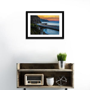 This canvas artwork captures a serene coastal sunset over the Australian Pacific Ocean. Featuring a curving bridge and rocky cliffs, it brings a dramatic yet calm atmosphere to your space.