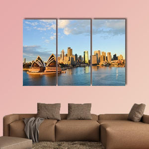 A photorealistic canvas showing the Sydney Opera House with the city skyline and harbor under a bright daytime sky. Blues, whites, golds and grays capture clouds and water reflections for a scenic, coastal mood. Works well in modern living rooms or coastal-inspired rooms.