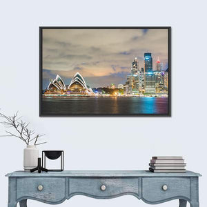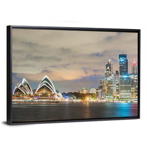A wide dusk view of the Sydney Opera House and city skyline over the harbor, with illuminated buildings and reflective water. The photorealistic, modern scene feels serene and iconic, and it suits modern interiors and wall decor.