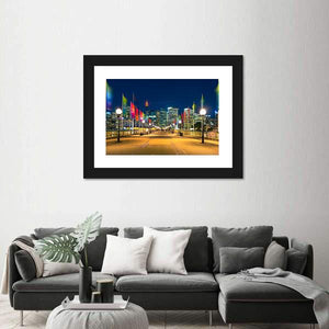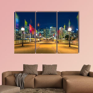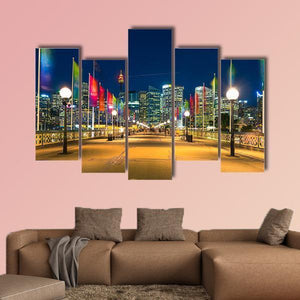 A nighttime cityscape of Pyrmont Bay in Darling Harbour, featuring a flag-lined pier, streetlights, and an illuminated city skyline. Leading lines and a symmetrical composition give the scene a vibrant, festive energy in blues, yellows, reds, and greens, suited to modern living rooms or contemporary offices.