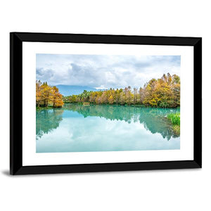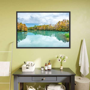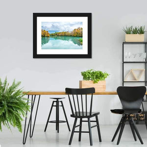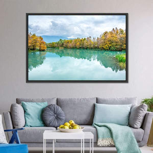Green Lake With Reflection Of Trees shows trees and distant mountains mirrored in calm water beneath a cloudy autumn sky, giving a serene, natural feel. Rendered in a realistic, vibrant style with blue, green and warm orange tones and composed using the rule of thirds, this canvas print suits modern home and room decor as a tranquil nature focal point.
