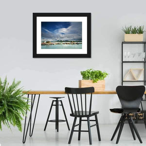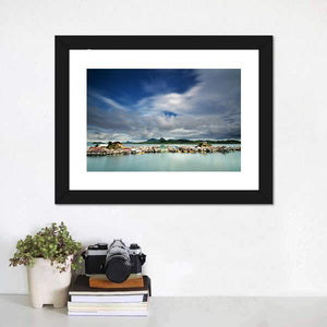 Kabalutan Village, Indonesia shows a village on stilts beside calm water, framed by distant mountains and a wide sky with wispy clouds. The blue‑green palette and rule-of-thirds composition create a peaceful, serene, and vast atmosphere — suited to island- or sea-inspired rooms and modern nature-focused spaces.