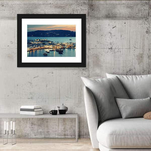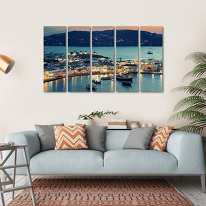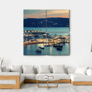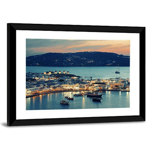 Capture the serene beauty of Mykonos Bay with this tranquil canvas. Featuring a stunning sunset that illuminates a coastal town with windmills in the distance, this artwork evokes calmness and warmth. It's an ideal addition to enhance any wall decor.