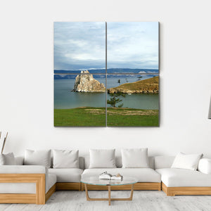 This canvas art captures the serene beauty of Olkhon's shore, featuring a dramatic rock formation and a tranquil lake surrounded by lush greenery. The photorealistic style transports you to this picturesque landscape, perfect for adding a touch of nature to any room.