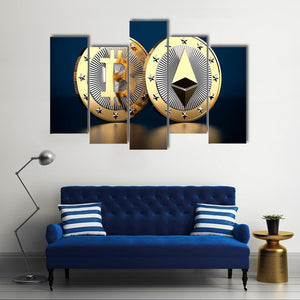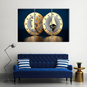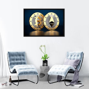 Bitcoin & Ethereum canvas wall art centers two cryptocurrency coins side-by-side, one with the B symbol and the other with the Ethereum symbol, in a modern, abstract digital composition. Gold, silver, black, and blue tones give it a tech-forward look that fits modern or tech-inspired rooms.