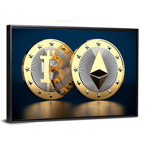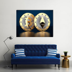 This canvas features intricate renderings of the Bitcoin and Ethereum coins in a modern, luxurious style. With a palette of gold, silver, and dark blue, it adds a digital touch to any space.