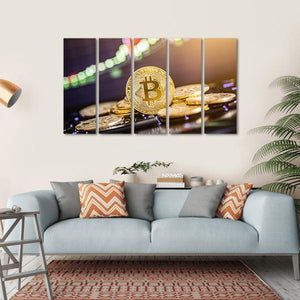 This striking canvas art features a golden bitcoin coin against a blurred stock market graph, embodying themes of financial growth and success. Its modern and abstract style makes it a captivating addition to any room decor.