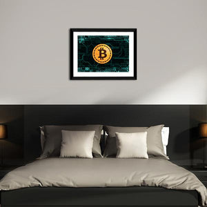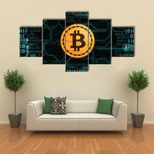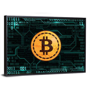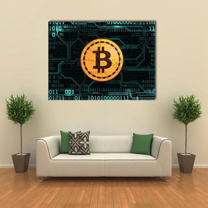 This abstract canvas art features a striking gold bitcoin symbol at its center, surrounded by a rich black background adorned with vibrant green and blue circuit board patterns, as well as numerical binary code. Perfect for a modern, tech-inspired decor.