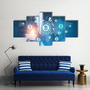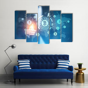 Businessman With Bitcoin Canvas Wall Art centers a glowing bitcoin symbol within a circular, abstract composition layered over a subtle world map and network connections. The piece feels futuristic and technological, with a blue, white, gold and orange palette that reads as modern and digital. It pairs well with contemporary home or office decor, especially spaces with a tech-forward or minimalist look.