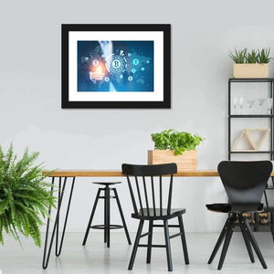 This canvas art features a dynamic representation of the bitcoin network intertwined with a world map and glowing light. The use of blue, white, and orange hues creates a futuristic and innovative atmosphere that complements modern décor.