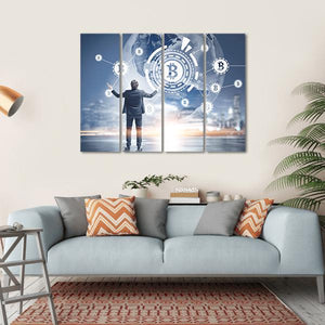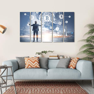 This striking canvas print features a businessman with arms outstretched, surrounded by glowing bitcoin symbols and a digital globe. The colors of blue, white, grey, and gold create a futuristic and technological feel, making it a captivating addition to modern spaces.