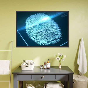 This striking canvas art features a glowing blue fingerprint, surrounded by dynamic light streaks. With a modern and abstract style, it evokes a techy and futuristic atmosphere that makes it a captivating addition to any space.
