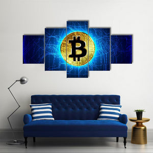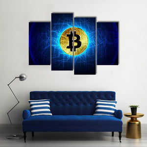 A centered, glowing bitcoin symbol sits over a blue and gold circuit board pattern, rendered in an abstract, modern style. The piece gives a futuristic, digital, technological mood and fits well in modern living spaces or tech-focused rooms.