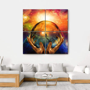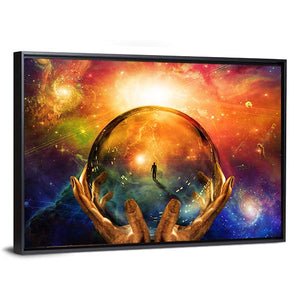 This captivating canvas artwork features a silhouette of a person holding a crystal ball, revealing a galaxy of colors. With a palette of orange, blue, and gold, it creates a mysterious and ethereal atmosphere, perfect for modern decor.