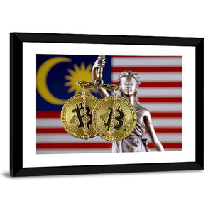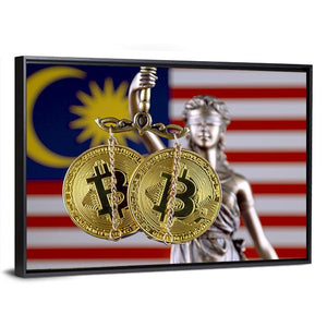 This canvas art features the Malaysia flag alongside Lady Justice, who holds scales with Bitcoin coins. The vibrant palette of gold, red, blue, and yellow creates a symbolic atmosphere, merging themes of finance and justice.