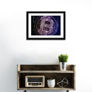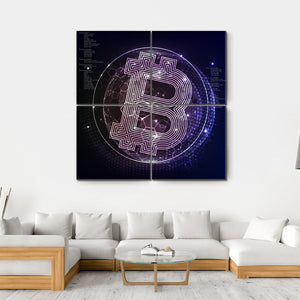 This striking canvas features the Bitcoin logo, enveloped in a futuristic color palette of purple, blue, and pink. The abstract design incorporates network lines and a glowing effect, adding depth and a digital vibe, making it an ideal addition to any modern space.