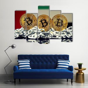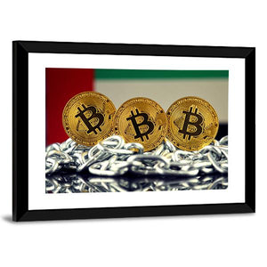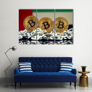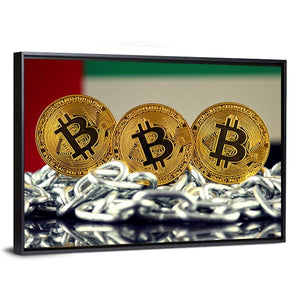 This striking canvas art features bitcoin coins and a flag, draped with a silver chain. Its rich palette of gold and silver conveys a sense of financial security and wealth.