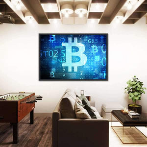 This canvas art features a prominent bitcoin symbol set against a digital backdrop of binary code. The modern, tech-inspired design in blue, black, and green adds a contemporary touch to any space.