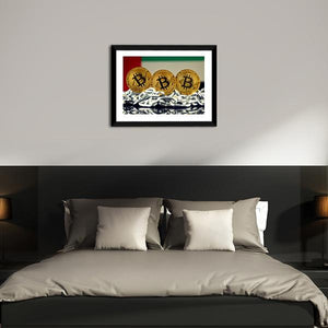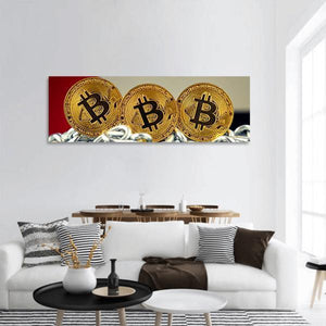 Three golden bitcoin coins sit at the center of this modern, abstract panoramic print, resting on a bed of silver links. Red and grey background elements add contrast and create a bold, affluent mood. It works well in modern offices or tech-focused rooms as crypto-themed wall decor.