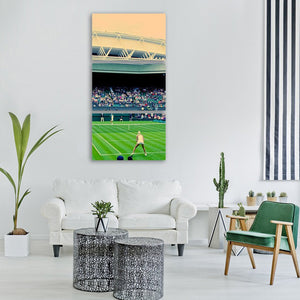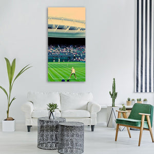 This vertical canvas art captures the dynamic energy of a tennis match at Wimbledon, featuring a player in motion against a backdrop of enthusiastic spectators. The vibrant palette of green, yellow, and white evokes an athletic and competitive mood, making it a striking addition to your wall decor.
