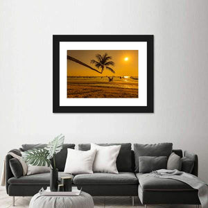 This canvas art captures a serene sunset over a tropical beach, featuring a leaning palm tree and boats resting on the water. With warm hues of orange and yellow contrasting against the calming blue ocean, it brings a tranquil vibe that complements coastal or modern décor.