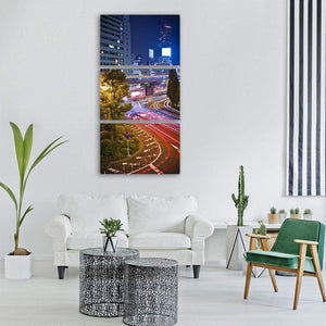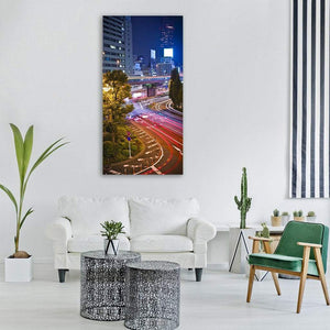 A long-exposure photograph of a Tokyo city road with streaking light trails, buildings, and trees. The vivid blue, yellow, red, and black palette creates an energetic, modern cityscape that suits contemporary living rooms, entryways, or offices seeking colorful urban character.