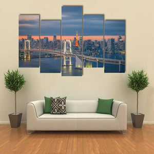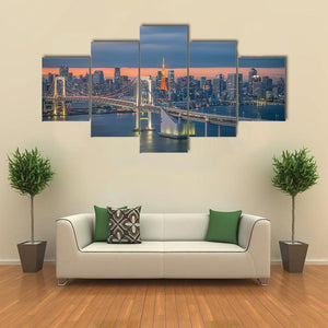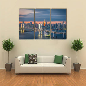 This canvas shows the Rainbow Bridge, Tokyo Tower and the Tokyo skyline at dusk. A wide-angle, elevated view and a blue‑and‑orange palette highlight city lights and water reflections for a modern, urban feel. It pairs naturally with modern living rooms or offices looking for a metropolitan accent.