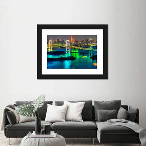 This canvas art features a vibrant city skyline of Tokyo, showcasing the illuminated Rainbow Bridge against the backdrop of tall buildings and reflective water. With its energetic colors and modern photorealistic style, it adds a lively touch to any space.