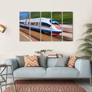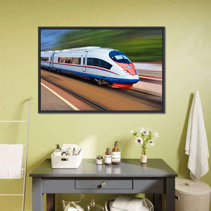 This canvas art features a high-speed train racing through a blurred landscape, capturing a modern, dynamic atmosphere. The vibrant palette of white, blue, orange, red, green, and brown adds energy to any wall, making it an ideal piece for contemporary décor.