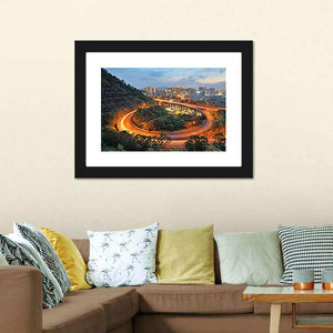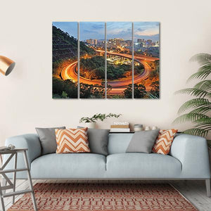 This vibrant canvas captures a bustling city skyline featuring a dynamic highway interchange lit by the glow of night. With energetic hues of orange, blue, green, and gray, it brings the lively essence of urban life into your space.